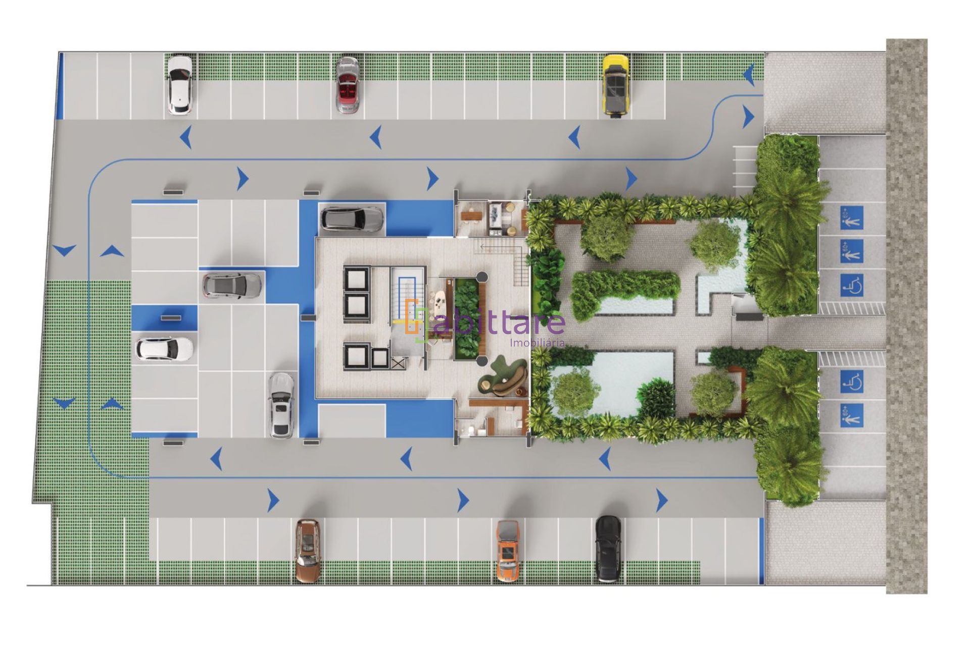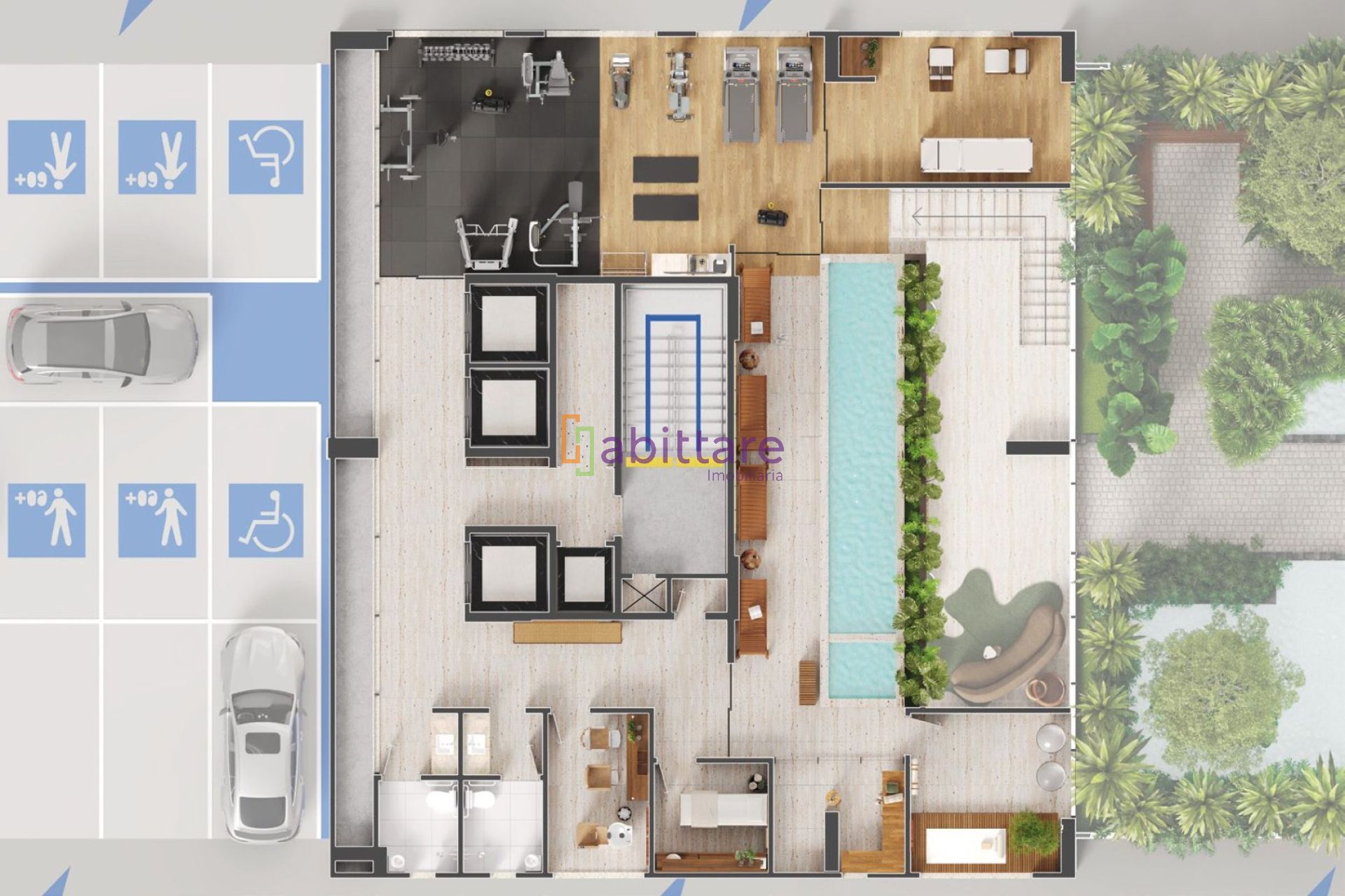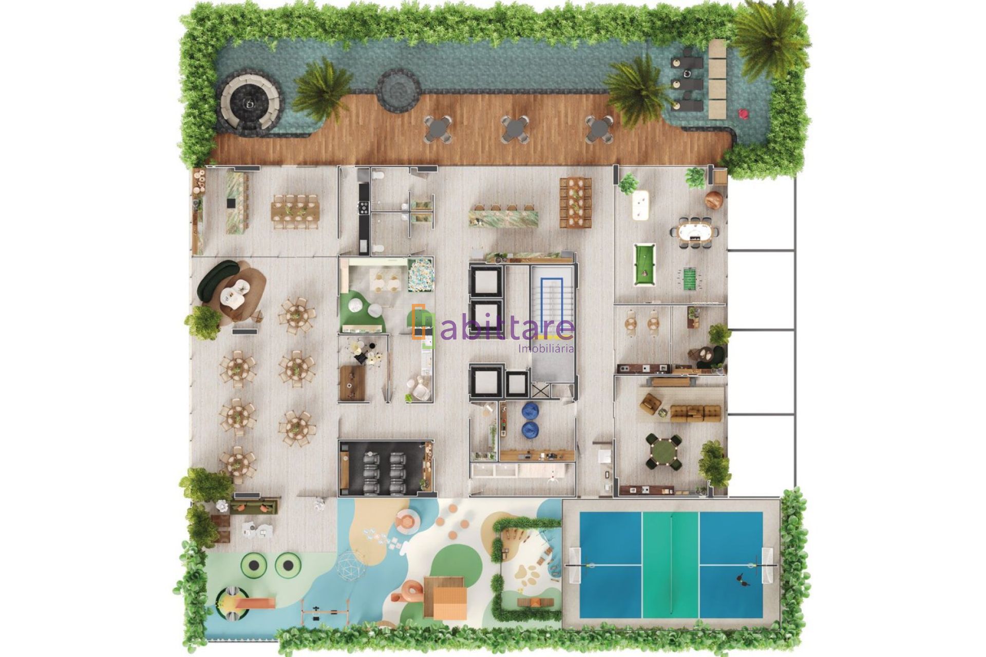 Pavimento de lazer com salão de festas com lounge, espaço gourmet, brinquedoteca, garage band, cinema, espaço artes, salas de estudo e games, espaço pet care, petplace, piscina com deck, prainha e raia, hidromassagem, espaço churrasco, sala de jogos, charutaria, wine lounge, playground e quadra poliesportiva