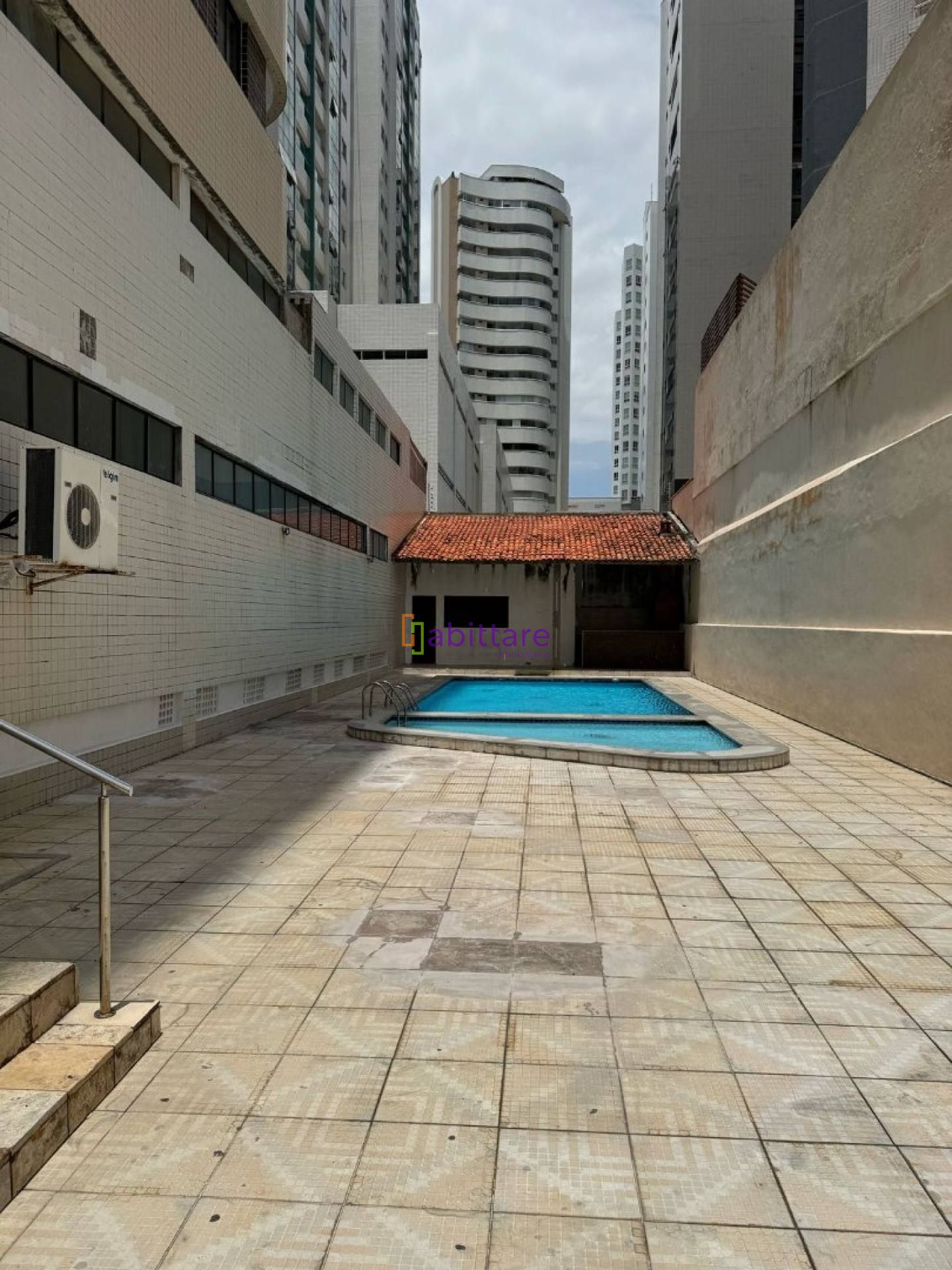 Área de lazer com piscina, salão de festas e quadra poliesportiva